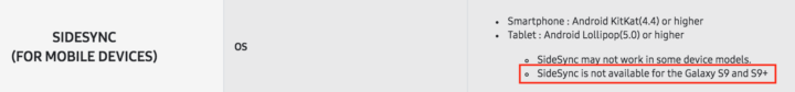 While the Galaxy S9 meets the first requirement since it runs the latest iteration of Android which is several steps above KitKat, the official SideSync website clearly mentions that “SideSync is not available for the Galaxy S9 and Galaxy S9+.”