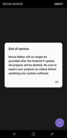 The app is currently receiving an update to version number 2.3.03.10 and brings some bad news along with it. Once you fire up the updated app, you will be greeted with a message informing you about Samsung’s decision to discontinue the app after the Android P update. We currently don’t know if Samsung will just abandon the Movie Maker app or replace it with a new solution.
