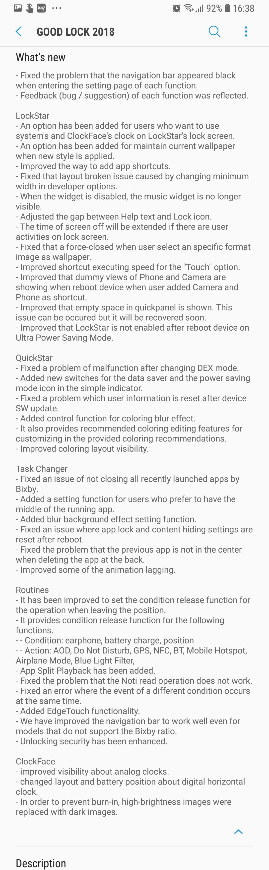 When you combine all the major Good Lock 2018 features, the changelog for the update is quite a big one. There are interesting new options littered throughout. In Task Changer, you can now enable background blur or make the recent apps screen center on the currently running app. A blur effect option has been introduced for the notification panel in QuickStar as well, along with the ability to disable or enable the data saver or power saving mode icons in the status bar. LockStar, Routines, and the ClockFace features have also received new functions and changes to existing ones, details of which you can see in the long screenshot below.
