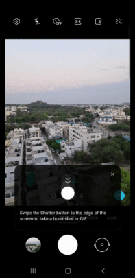 Samsung also introduced an additional option to capture GIFs instead of bursts photos when performing the swipe down shutter button gesture. For GIFs, tap the cogwheel icon in the viewfinder, tap Swipe Shutter button to edge to under Pictures, and select Create GIF (or Take burst shot if you want to revert to the default setting).