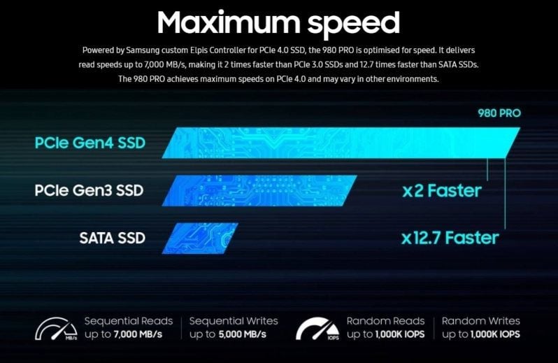 The 980 Pro SSD promises sequential read speeds of up to 7,000MB/s and sequential write speeds of up to 5,000MB/s. However, it should be noted that a computer is required to feature a PCIe 4.0 slot to achieve those read and write speeds. Currently, only PCs using AMD’s Ryzen 3000 series CPUs with X570 chipset motherboard feature PCIe 4.0 slots. Intel is expected to launch its 11th Gen. Core processors later this year with PCIe 4.0 compatibility.