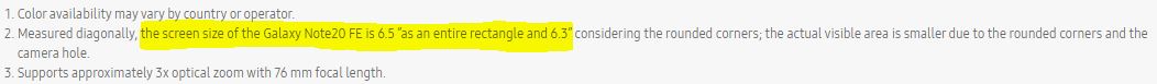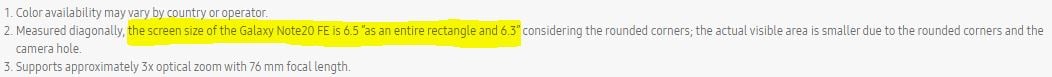 The official Galaxy S20 FE landing page published on Samsung’s Brazilian portal includes a few unusual mentions of the Galaxy Note 20 FE. Specifically, the fine print states the size of the Galaxy Note 20 FE screen to clock in at 6.5 inches or a 6.3-inch diagonal when including the screen’s round corners. This information appears to pertain to the Galaxy S20 FE and Samsung may have made a typo, but it’s not the only one.