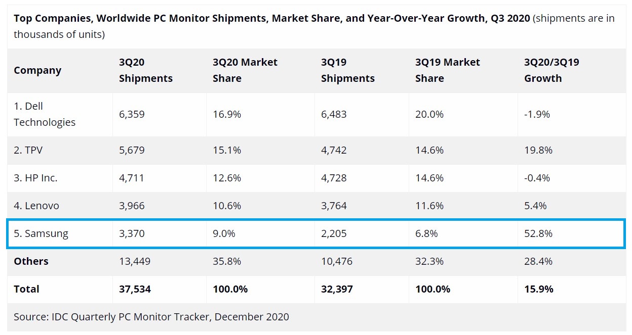 According to the latest report, Samsung sold 3.37 million computer monitors during Q3 2020, which is a whopping 52.8% jump in sales compared to the third quarter of 2019. Samsung’s market share increased from 6.8% YoY to 9%, and it was the fifth-largest computer monitor brand in the world. Samsung launched new productivity and gaming-focused monitors during the quarter.