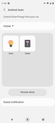 The SmartThings app’s icon appears on the Android Auto app launcher. After launching the app, you can turn smart home devices on/off with a simple click. You can also turn on/off automatic notifications for running Scenes from the Settings menu on the top right corner. You can also control SmartThings devices via Google Assistant on Android Auto.