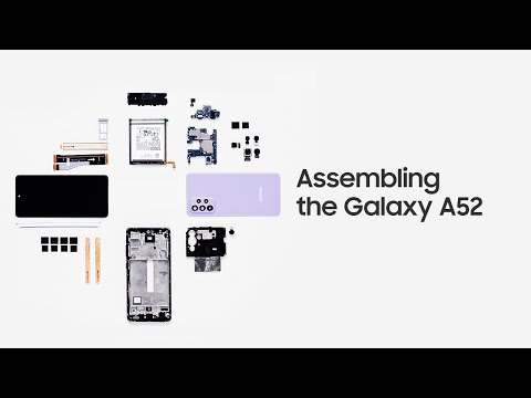 The first video shows all the internal and external parts of the Galaxy A52, including its screen, battery, camera modules, fingerprint reader, stereo speakers, processor, memory, storage, heat pipe, a cellular signal receiver, and the SIM card/microSD card tray. The step-by-step assembly process is explained with the help of a Samsung engineer.