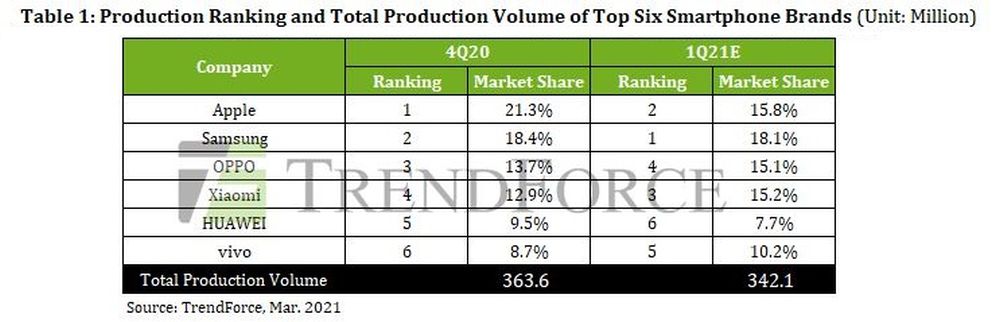 Samsung ranked second in terms of smartphone production volume in Q4 2020 but the company is about to dethrone Apple and capture the top spot in the first quarter of 2021, estimates market research firm TrendForce.
