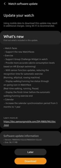 Aside from the new watch faces that were borrowed from the Galaxy Watch 4 series, the latest firmware update for the Galaxy Watch and Watch Active adds support for the Group Challenge widget, and should now provide more accurate data on calorie consumption based on the user’s heart rate.