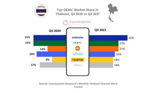 Meanwhile, in Thailand, Samsung distanced itself from Oppo and is now leading the market. A year ago, Samsung was tied with Oppo, each of which had a 21% share. Samsung now has a 22% shipment market share, whereas Oppo and Xiaomi have a 17% share each.