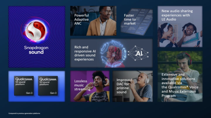 Qualcomm's S3 Gen 3 and S5 Gen 3 chips bring audiophile-grade audio quality, high-quality audio codecs, more effective Active Noise Cancellation (ANC), improved call quality, and longer battery life to wireless earbuds and headphones. These audio chips sit below Qualcomm's flagship audio chips: S7 and S7 Pro.