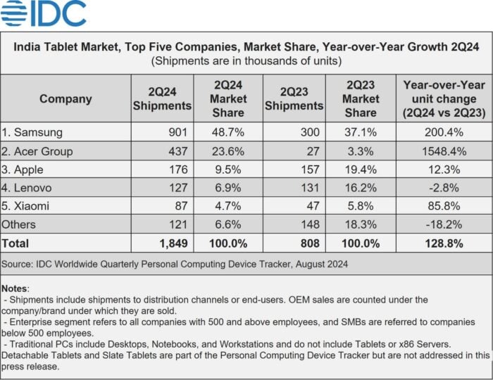 International Data Corporation (IDC) has just released an analysis of the tablet market in India in Q2 2024. According to the firm, Samsung shipped 901,000 tablets in the country in the last quarter, giving it the first position on the brand-wise shipment chart with a 48.7% market share. That’s three times the number of tablets (or 200% more tablets) it sold in Q2 2023, which was 300,000 units. Those are some very impressive numbers, not only in terms of market share but also year-over-year growth.