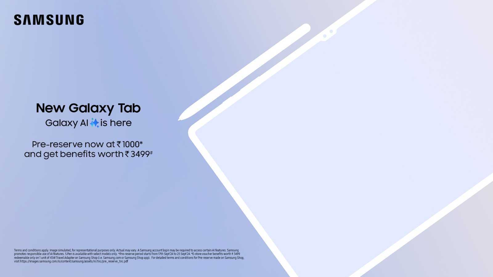 The banner suggests that prospective buyers in India will soon be able to pre-reserve the new Galaxy Tab for INR 1,000 ($12), and by doing so, they'll get benefits worth INR 3,499 ($42).