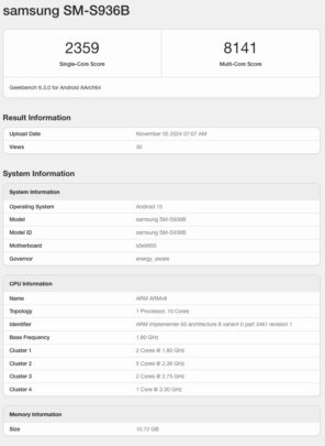 As you can see in the image above, the Exynos 2500 has a 10-core CPU divided into four clusters. The prime CPU core is clocked at 3.3GHz. It has five high-performance cores, two of which run at 2.75GHz and the rest at 2.36GHz. It has just two power-efficient CPU cores, running at 1.8GHz. The chip scored 2,359 points and 8,141 points in Geekbench 6's single-core and multi-core benchmarks.