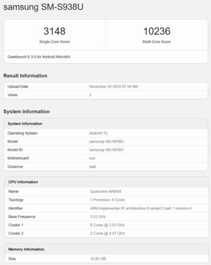 The other recent test from a few hours ago concerned the European S25+ variant, seemingly powered by the unannounced Exynos 2500 chip. The S25+ benchmark revealed single and multi-core scores of around 2360 and 8140 points.