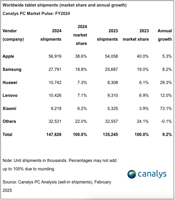 Market watchers say that, all vendors combined, global tablet shipments in 2024 grew 9.2% compared to 2023. Q4 shipments also improved 5.6% year-on-year.