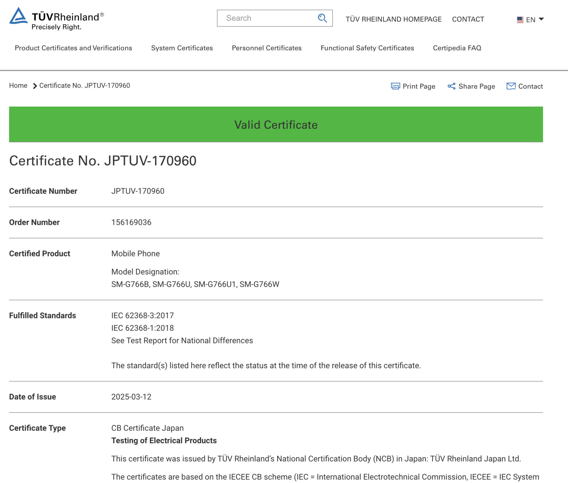 The Galaxy XCover 8 Pro’s TÜV Rheinland certification mentions four model numbers, SM-G766B, SMG766U, SM-G766U1, and SM-G766W. They are model numbers for the phone's international variant, carrier-locked and carrier-unlocked variants for the United States, and the Canadian variant.