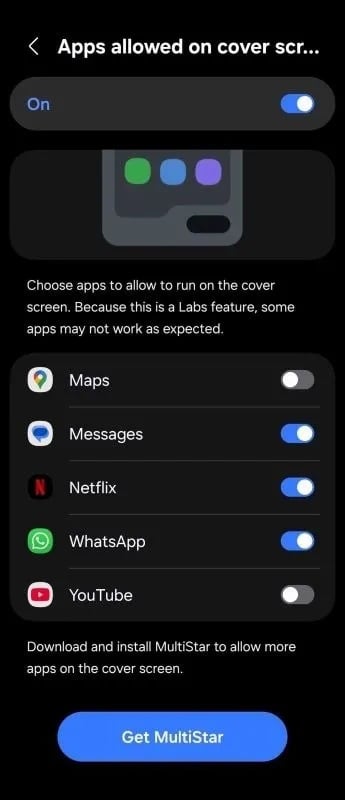 As spotted by 9To5Google, in the beta version of Android 15-based One UI 7.0 for the Galaxy Z Flip 6, which Samsung rolled out earlier this week, when you go to Settings » Advanced features » Labs to enable apps on the cover display, you will see a message that says “Download and install MultiStar to allow more apps on the cover screen.” Plus, you will see a button to ‘Get MultiStar’