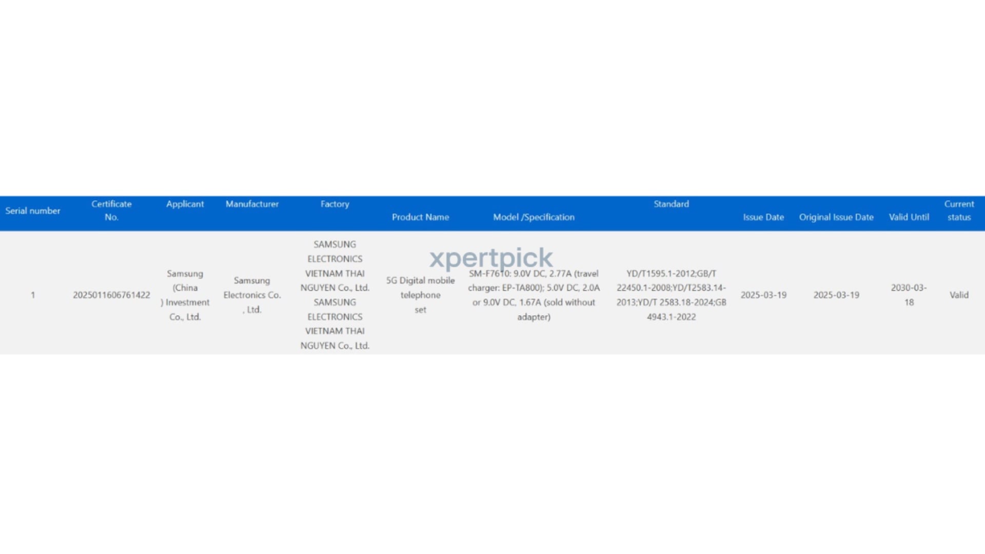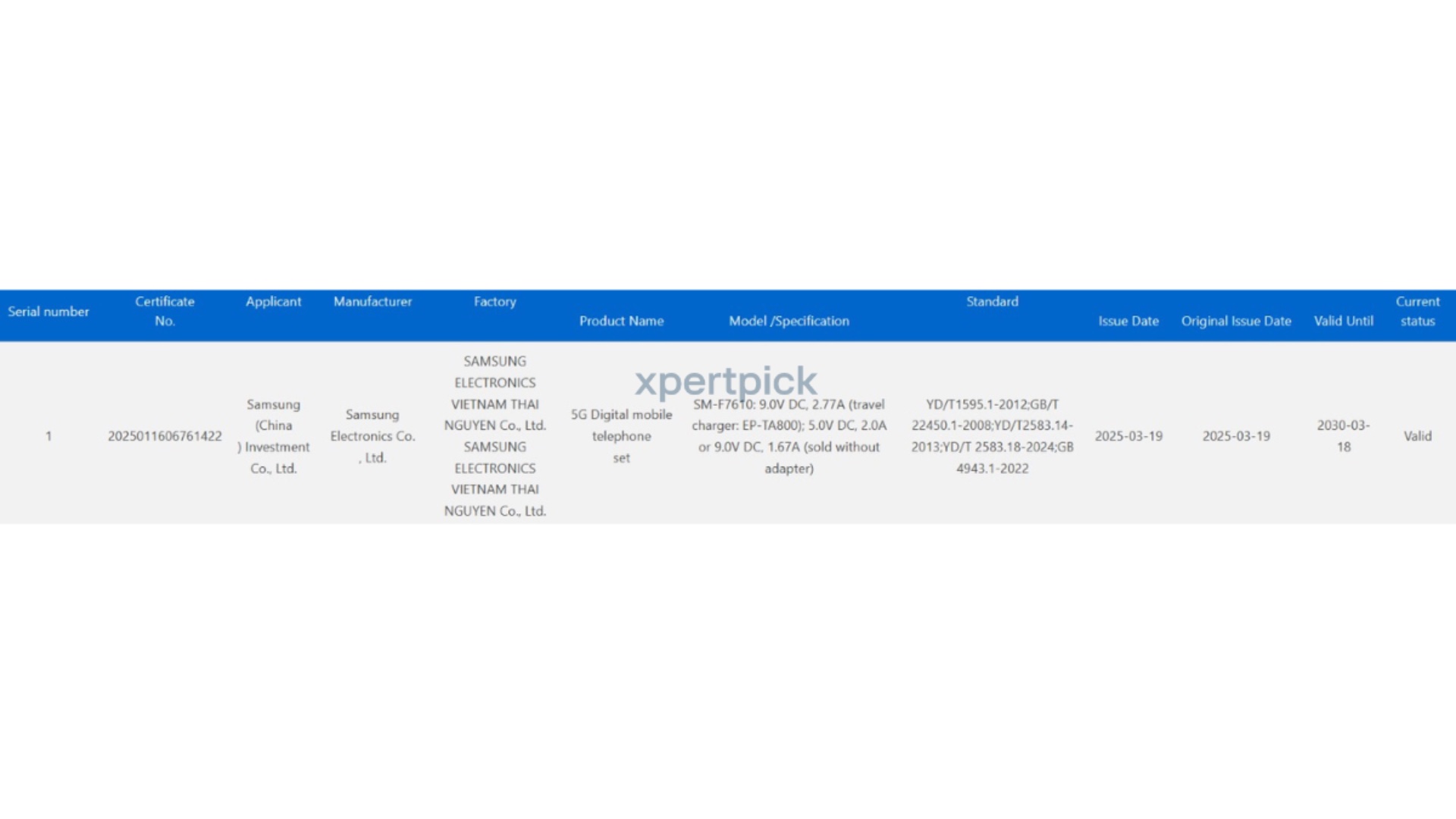 An unannounced Samsung phone with model number SM-F7610 has been spotted (via XpertPick) in the China Compulsory Certification (CCC) database. Its model number makes us believe it is the Galaxy Z Flip 7 FE for the Chinese market. The foldable phone was tested with the EP-TA800 charger, which offers a maximum power output of 25W (9V / 2.77A).