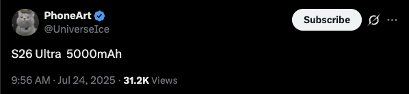On X, a popular tipster, @UniverseIce, claims that the Galaxy S26 Ultra will feature a 5,000mAh battery.