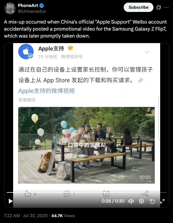 On Weibo, a social media platform in China, Apple’s official ‘Support‘ account put out a post with a promotional video of Samsung’s Galaxy Z Flip 7, highlighting the phone’s features (via @UniverseIce). As you might expect, the Cupertino-based tech giant, or the firm managing Apple’s social media accounts in the region, posted it accidentally, as they took it down within a few moments.