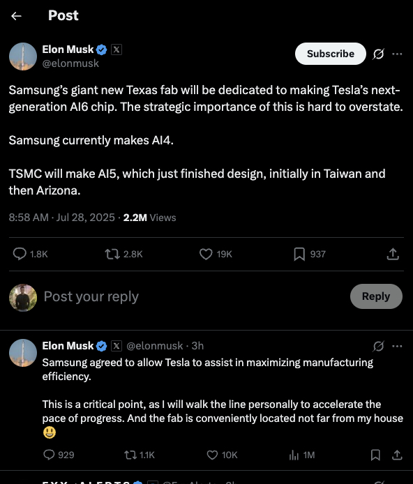 According to Elon, “The strategic importance of this is hard to overstate.” Since the news about the deal broke out, Samsung’s share price rose as much as 5%, making it reach the highest point since September 2024.