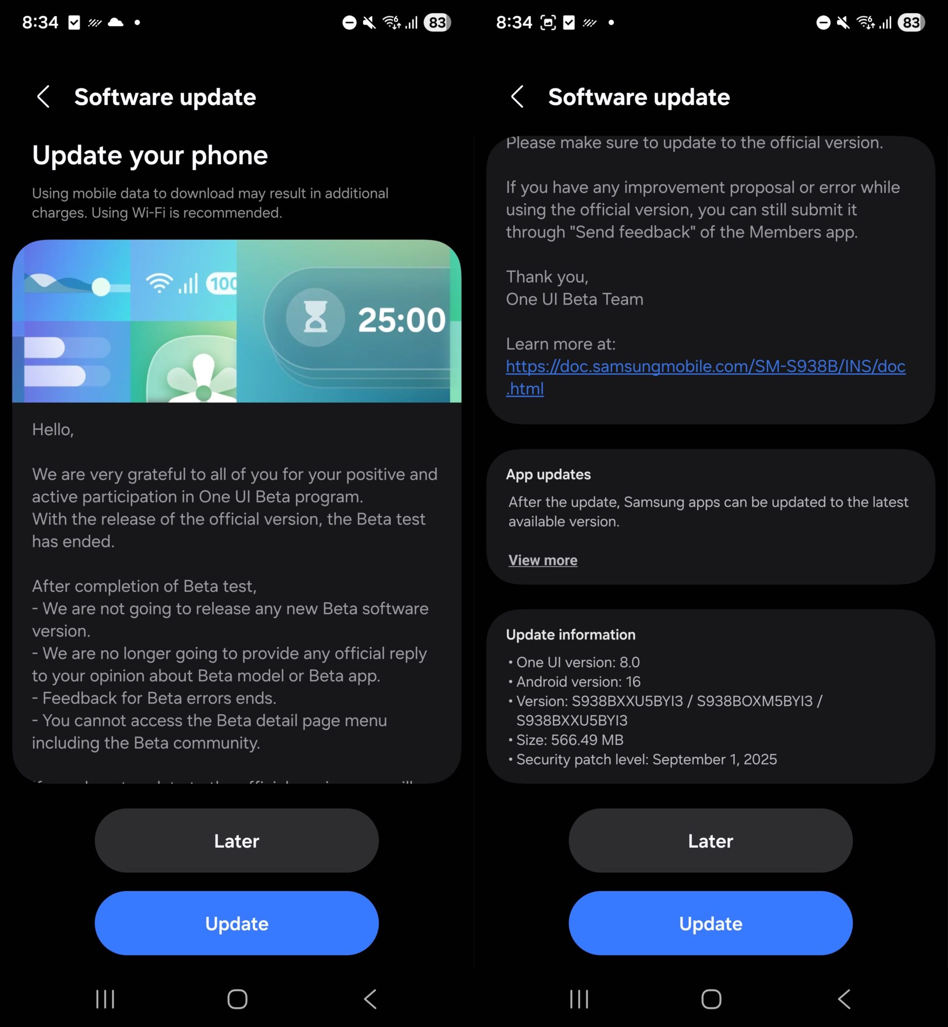 Samsung is rolling out the stable One UI 8 update only for the Galaxy S25, Galaxy S25+, and Galaxy S25 Ultra units that were enrolled in the beta program. The update is 566.49 MB in size and carries firmware version S93xBXXU5BYI3 (via Tarun Vats), as you can see in the screenshots below.