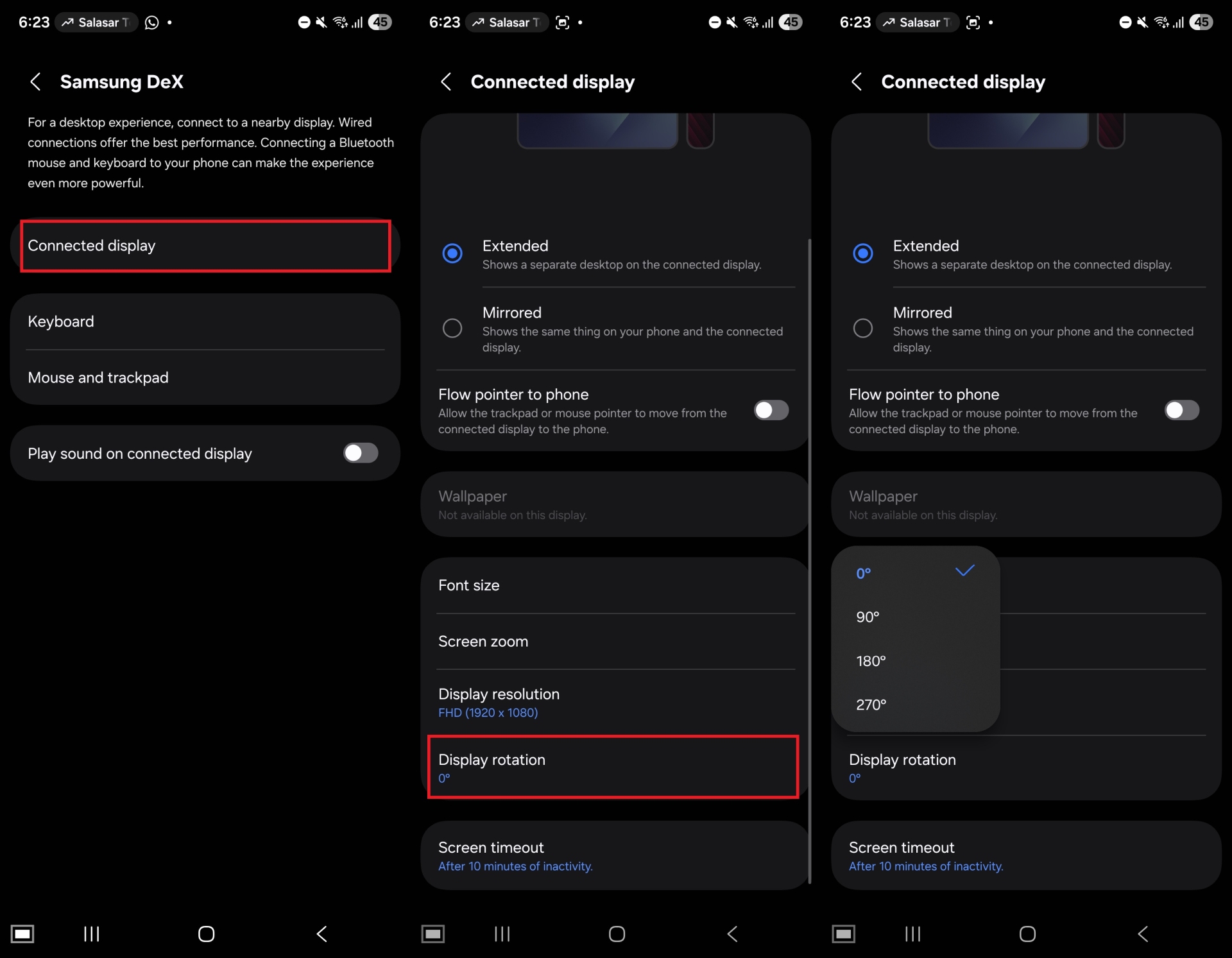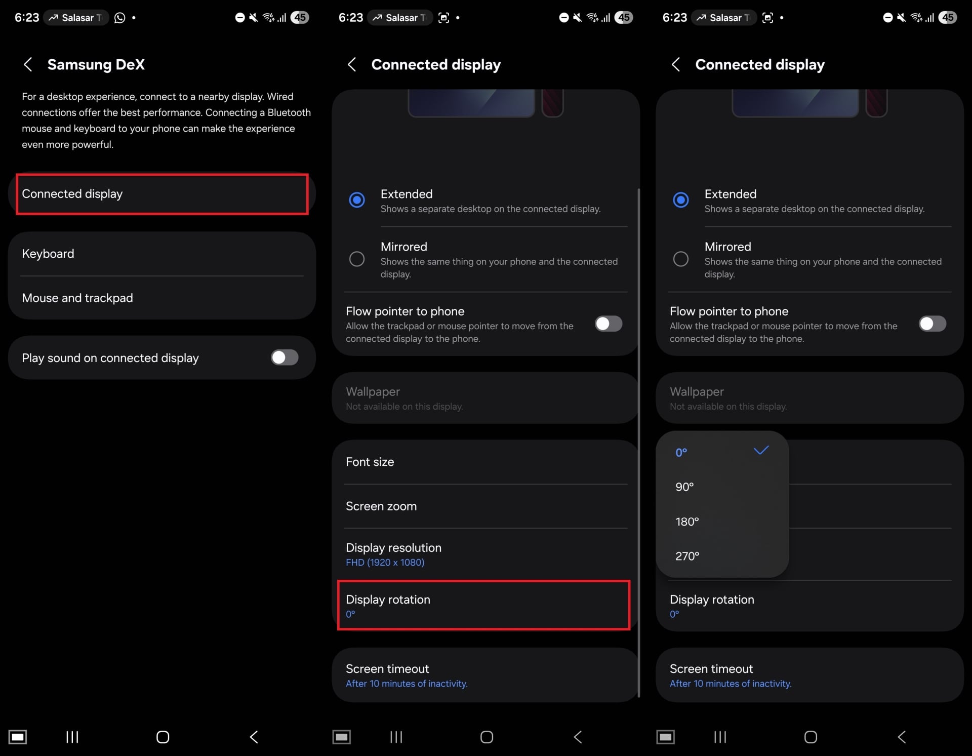 You can access these options by heading over to Settings » Connected devices » Samsung DeX » Connected display » Display rotation and selecting the necessary setting.