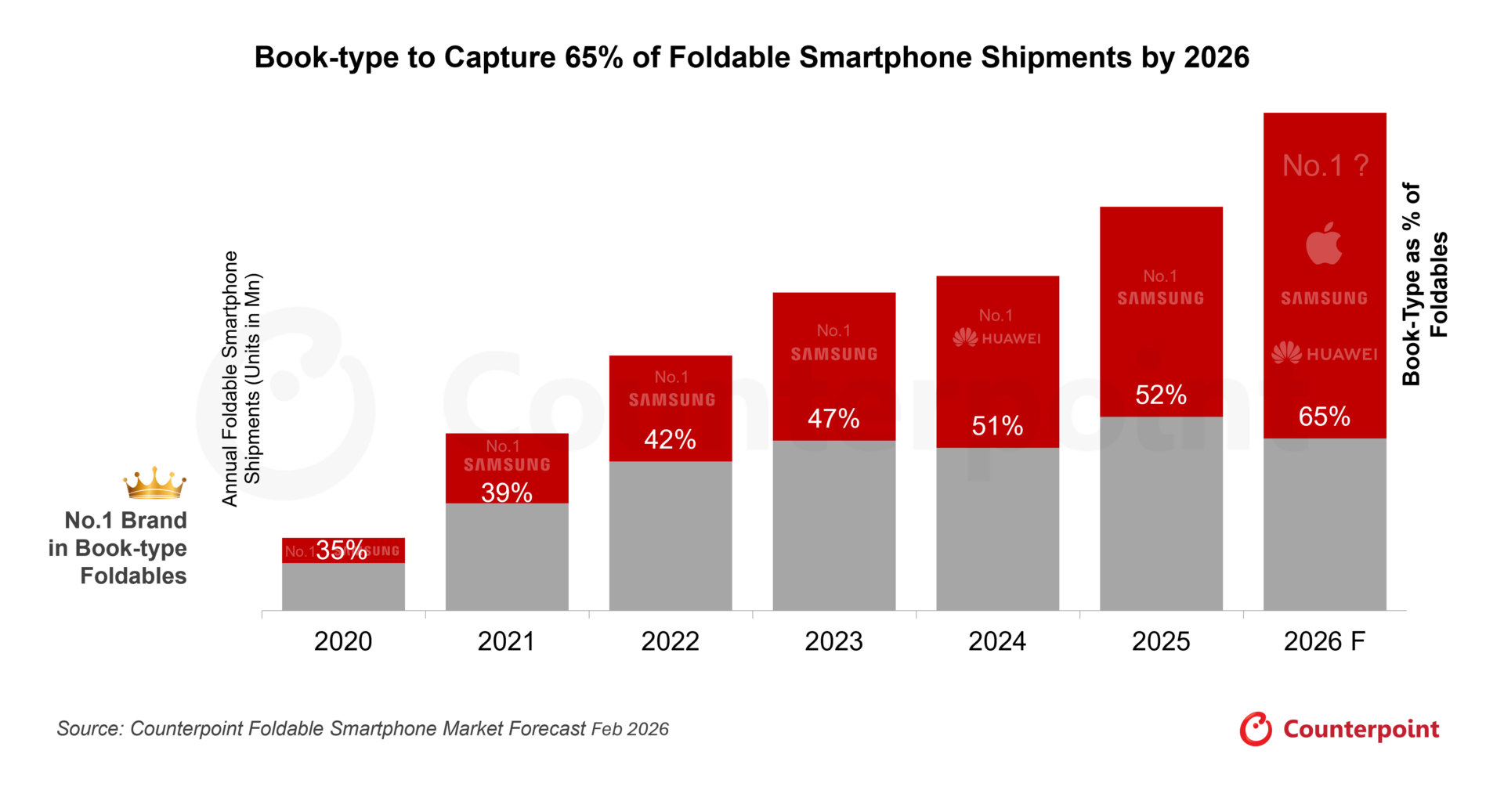 According to Counterpoint Research, book-like foldables held 52% of the market in 2025 versus 48% for clamshell models. In 2026, book-style devices are expected to slightly overshadow the Flip design and capture 65% of the segment.