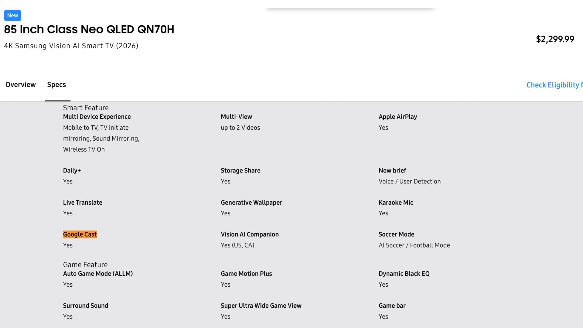 Google Cast on Samsung QN70H Neo QLED TV (2026) – Source: Samsung