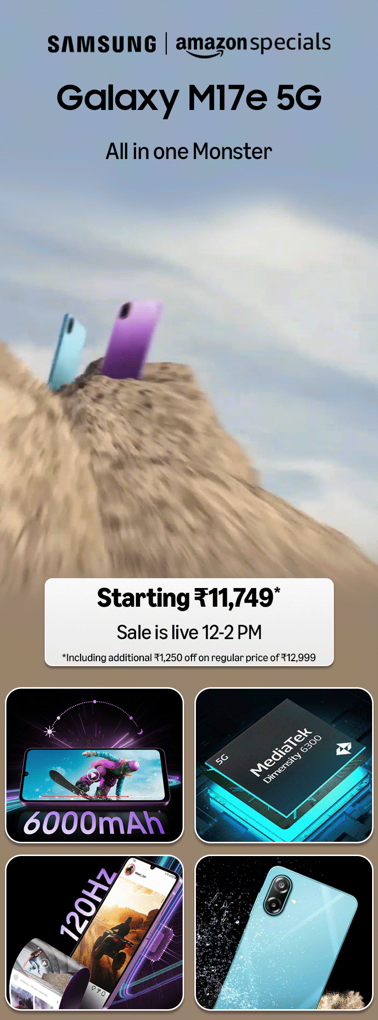 Samsung is offering the Galaxy M17e 5G in two configurations. The first variant offers 4GB RAM + 128GB storage, and the brand has priced it at INR 11,749. The second variant offers 6GB RAM + 128GB storage, and the company has priced it at INR 13,249. Prices are inclusive of an INR 1,250 discount. Samsung has made the phone available to purchase exclusively from Amazon India.