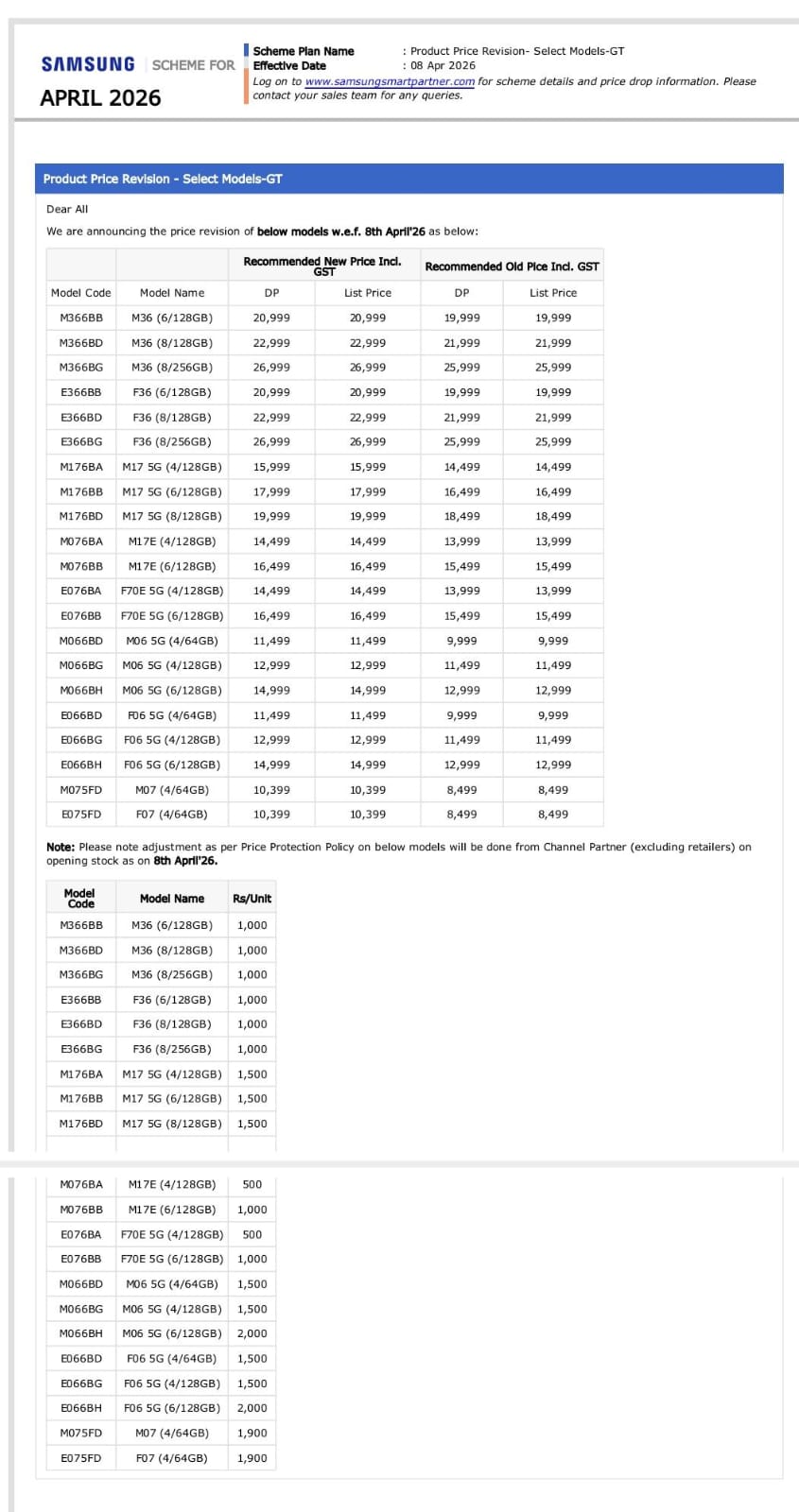 alleged samsung india communication to retailers in the country for price hike of galaxy f06, galaxy f07, galaxy f36, galaxy f70e, galaxy m06, galaxy m07, galaxy m17, galaxy m17e, and galaxy m36